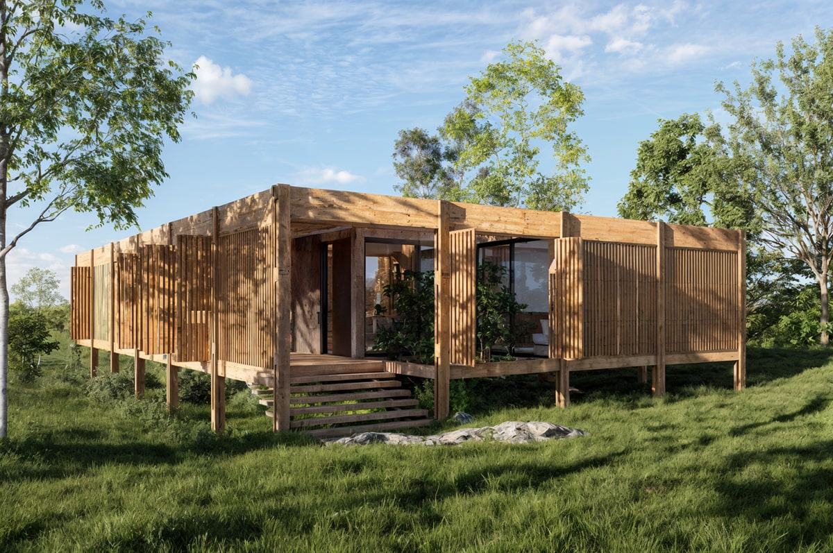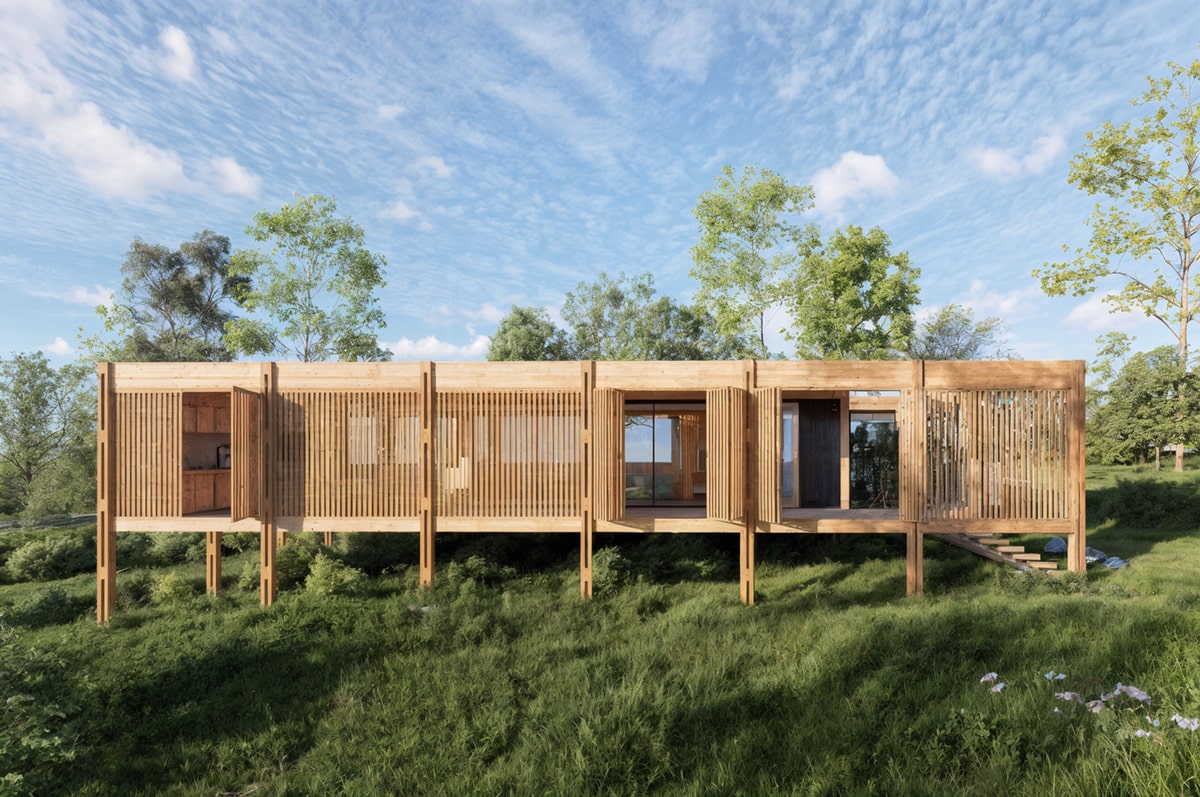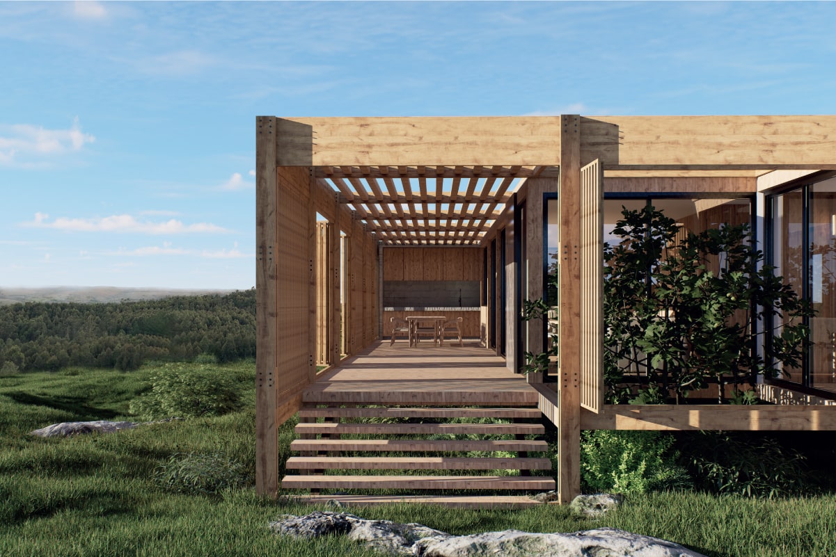 El sistema modular en madera se organiza de forma lineal, abriéndose hacia el paisaje y priorizando la ventilación, la sombra y la conexión con el exterior. La galería, los paneles móviles y la vegetación integrada actúan como filtros de luz y clima, generando una experiencia de habitar flexible y sensible al entorno.