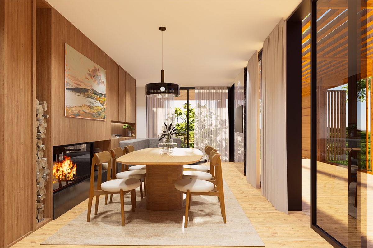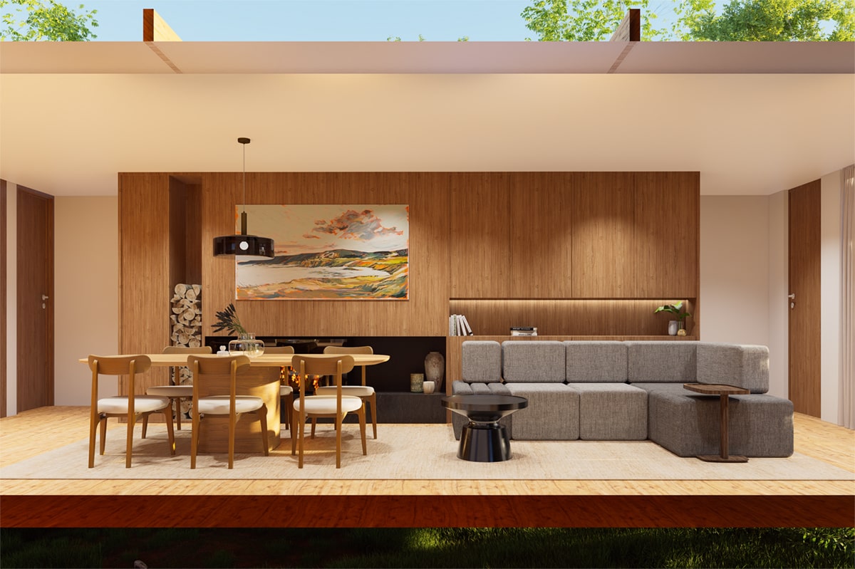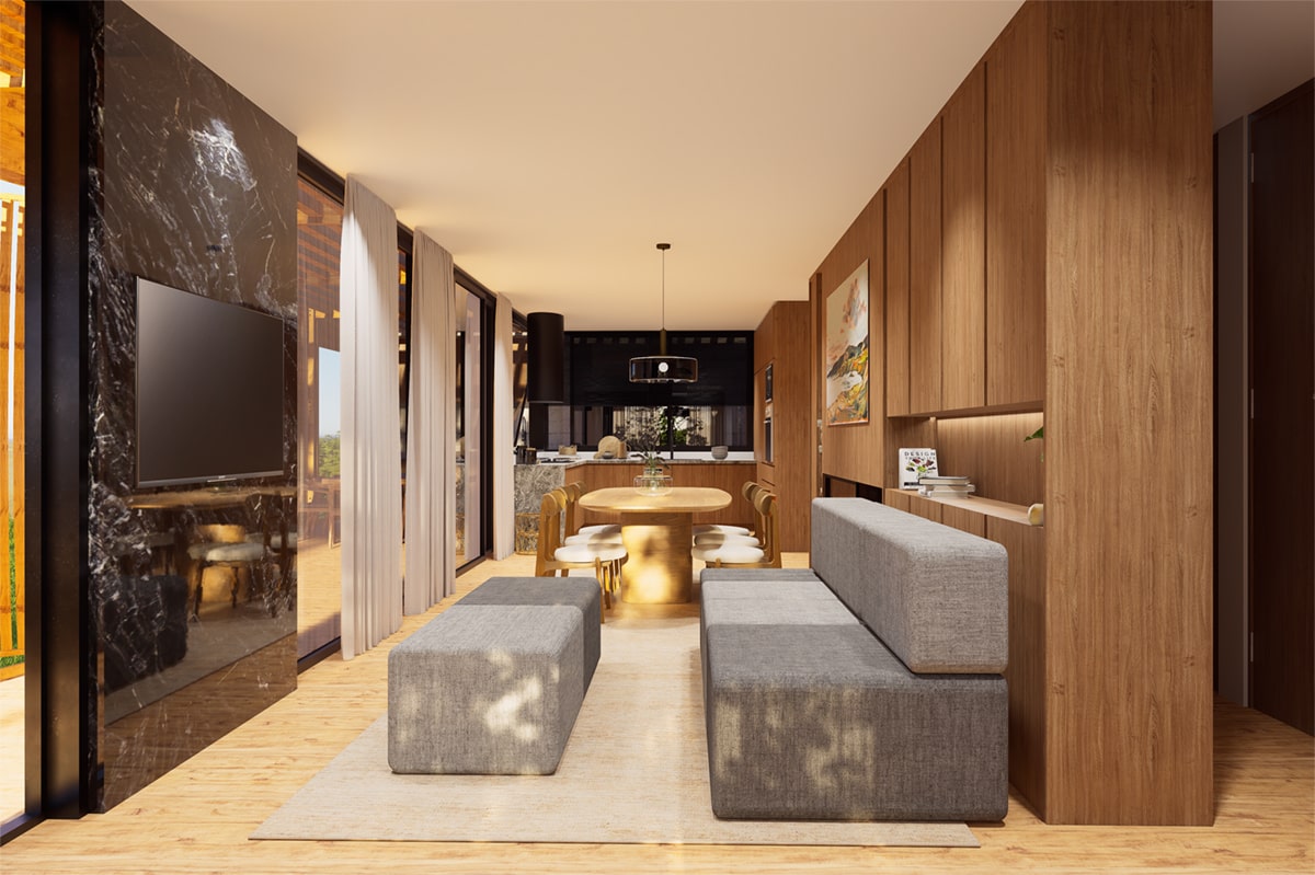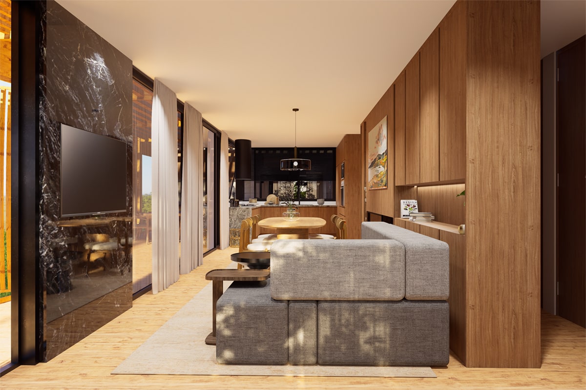 El sistema modular en madera se organiza de forma lineal, abriéndose hacia el paisaje y priorizando la ventilación, la sombra y la conexión con el exterior. La galería, los paneles móviles y la vegetación integrada actúan como filtros de luz y clima, generando una experiencia de habitar flexible y sensible al entorno.