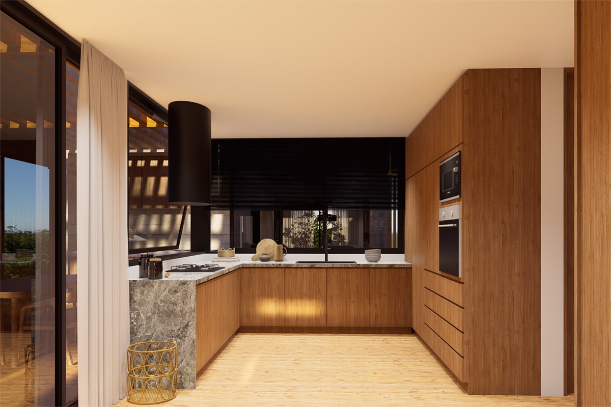 El estar, la cocina y la galería se conectan en un mismo gesto. El verde se hace parte del interior y la luz guía el recorrido y redefine los límites entre adentro y afuera.